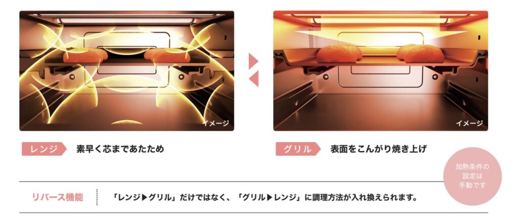レンジとグリルのリレーが自動で行われるので、私たちはスイッチを押して待つだけでいいんです。