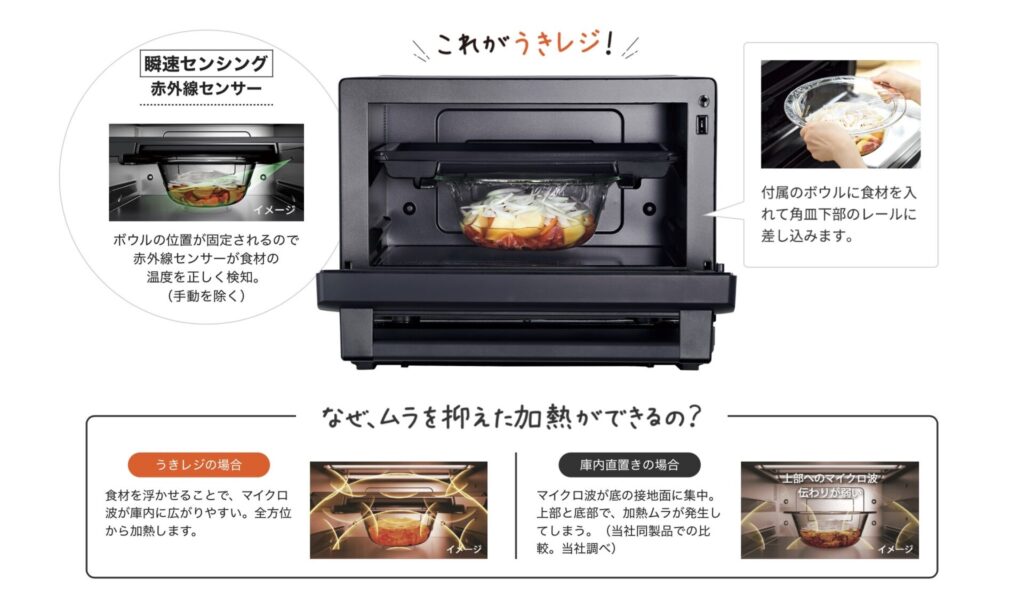 空中に浮いた状態でマイクロ波を全方向から受けるので、加熱ムラが驚くほど少なくなります。